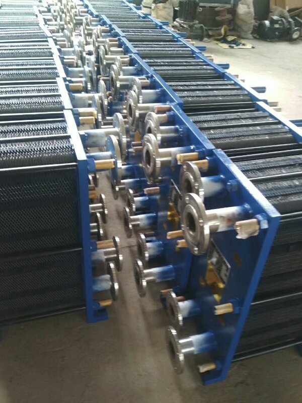 5、傳熱板片:傳熱板片是換熱器主要起換熱作用的元件,一般波紋做成人字形,按照流體介質(zhì)的不同,傳熱板片的材質(zhì)也不一樣,大多采用不銹鋼和鈦材制作而成。