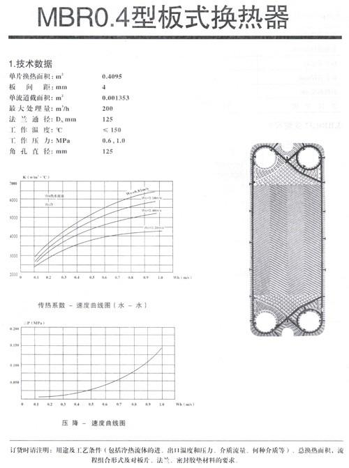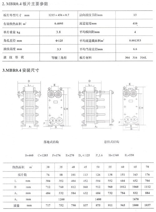MBR0.4型板式換熱器主要由不銹鋼壓制的傳熱片、密封膠墊、夾緊螺栓和壓緊板整機框架等零部件組成。可耐各種腐蝕介質。傳熱效率高,冷熱介質通過相鄰板片流經各自通道進行換熱。由于板片上有人字形波紋,介質流動形成湍流, 因此獲得較高的換熱效率。高效節能,傳熱系數高。其換熱系數可達3000-4500kcal/m2.゜C.h.是相同流速下管殼式換熱器的3倍以上。使用安全可靠,結構緊湊,體積小,占地少,是同等換熱面積管殼式換熱器的五分之一左右。組合靈活,調整維修方便。松開壓緊螺母即可進行清洗維護,更換膠墊或板片。板式換熱器板片均為獨立元件,可按用戶要求隨意增減換熱面積和流程。密封槽設置泄液液道,各種介質不會串通,即使出現泄漏,也是向外排出。